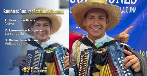 La versión 47 del festival vio brillar al neivano Jhon Jairo Rivas Perdomo, “El Pollo Rivas”, quien se impuso en la reñida categoría Acordeón Aficionado. Su talento superó a los participantes de departamentos como Atlántico, Guajira, César, Sucre, Magdalena, Córdoba, Bolívar y Boyacá, consolidando su posición como uno de los mejores acordeoneros del país. En la categoría infantil, Maximiliano Gómez Pérez y Jacelyn Rivas Perdomo representaron con orgullo a Neiva.